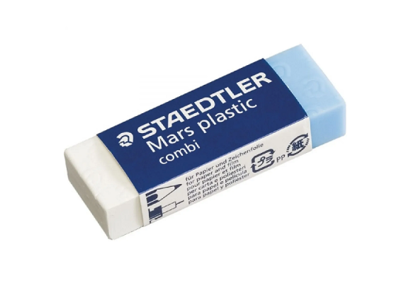A Mars Plastic Combi foi feita para múltiplos usos, e tem o corpo com duas composições diferentes: uma mais macia, na cor branca, para apagar grafite, e outra mais firme, na cor azul, que é ideal para apagar tinta nankim em papel vegetal.